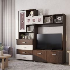 Модульная гостиная Белла - это функциональная стилизованная модель с простыми геометрическими формами. Особый шарм ей придаёт контрастное решение фасада в цветовом сочетании венге/дуб атланта, а также отделка зеркалами с фьюзингом (художественные вставки из цветного стекла), пескоструйной обработкой и еврокромкой.