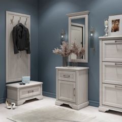 Комплект состоит из тумбы, двух пеналов-витрин и навесной полки.